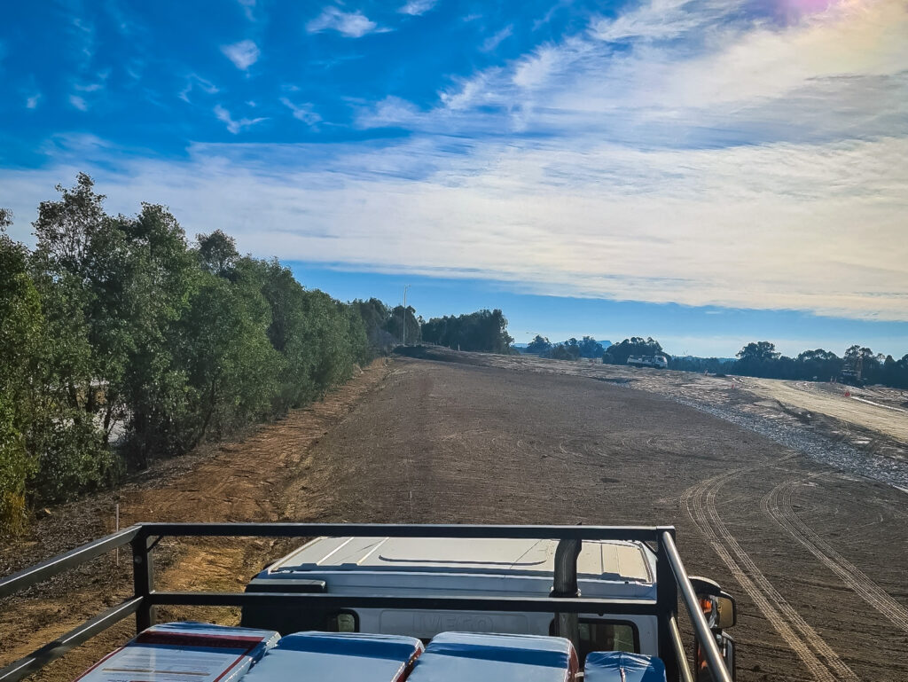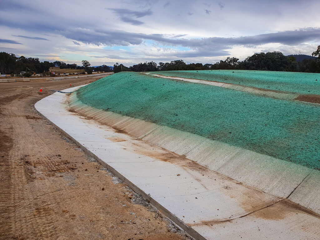 ECS treated new embankments created by civil construction with hydroseeding to begin the revegetation process, with the soil binders in the hydroseed mix helping to hold the soil and stabilise the fresh earthworks to minimise silt and erosion while the seed germinated.
