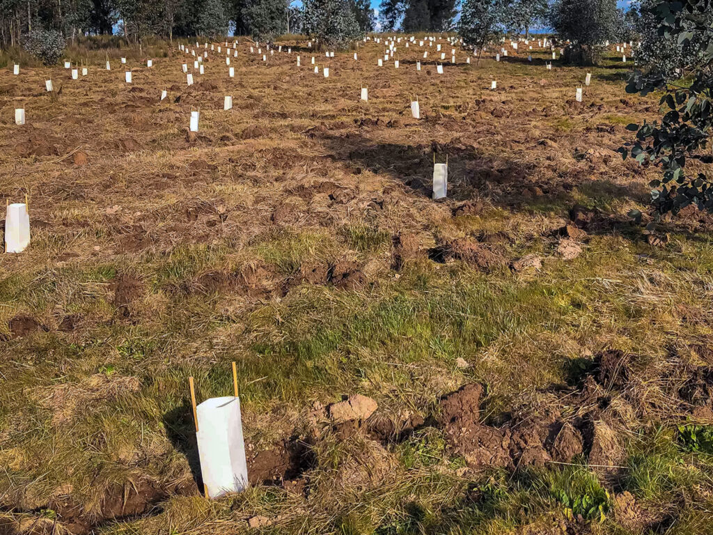 ECS conducted preliminary herbicide treatment and deep ripping in the open areas before planting. For the larger open areas, the tree planter unit allowed us to install thousands of trees each day, while manual planting carried out the understorey plantings below existing trees that the tractor unit couldn’t access. All areas were staked and guarded at the time of planting.